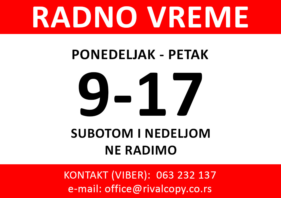 Rival Copy je nastao daleke 1991. godine sa vrlo skromnom idejom ali su ga poverljivost, pouzdanost, ljubazno osoblje, trud, poštovanje rokova kao i vrhunski kvalitet usluge doveli na visok nivo. Uvek smo spremni za poštenu, korektnu saradnju.